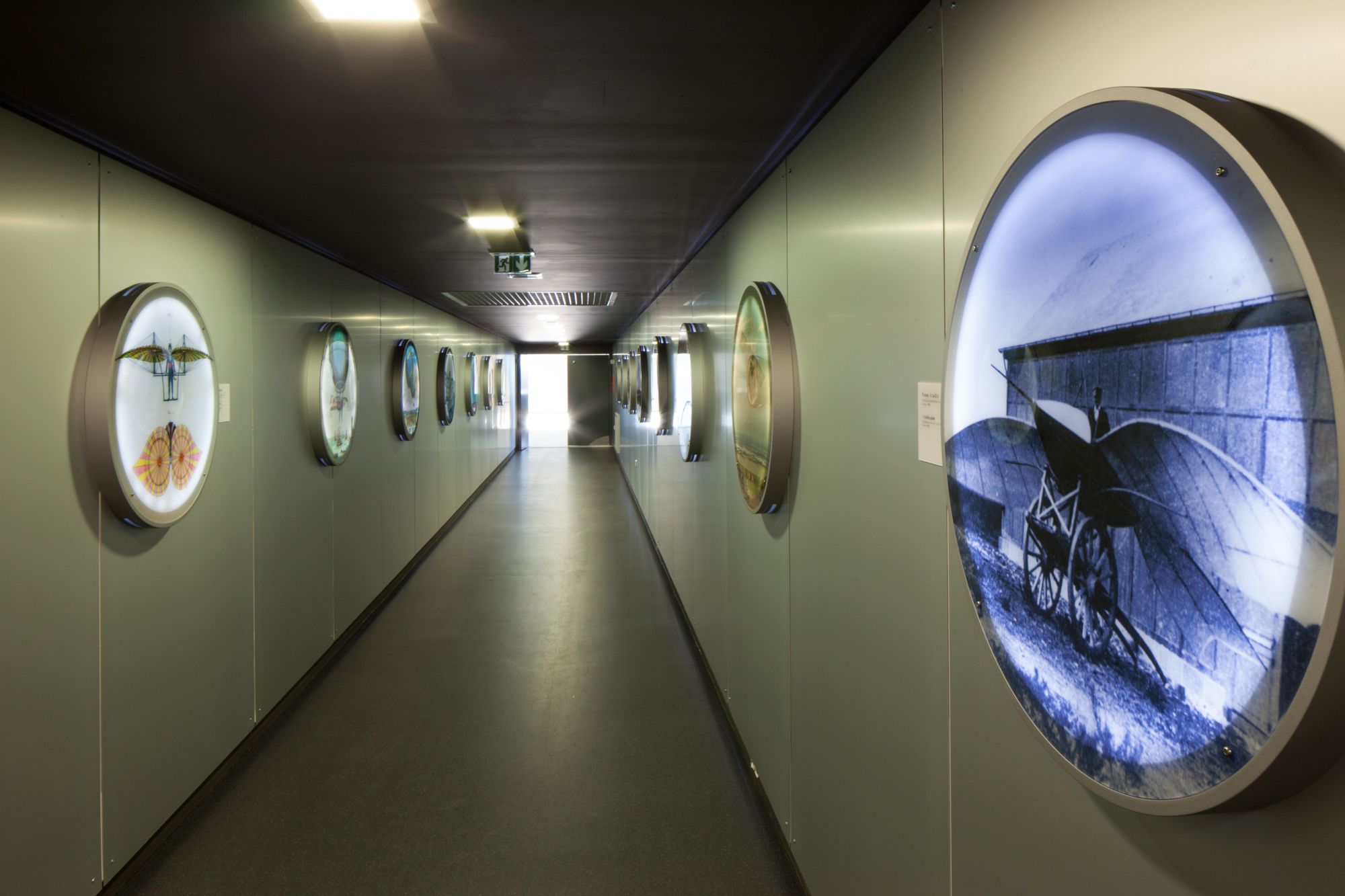 Une allée semblable à celle d'un avion, retraçant l'histoire de l'aviation dans des hublots